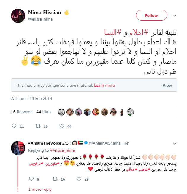 وانتبه أحد حسابات معجبي اليسا الى الأمر، مغرداً عبر موقع "تويتر": "تنبيه لفانز أحلام واليسا، هناك أعداء يحاولوا يفتنوا بيننا و يعملوا فيديوهات كتير باسم فانز احلام او اليسا. ولا تردوا عليهم ولا تهاجموا بعض لو شو ما صار، و كمان كلنا عندنا مقهورين منا كمان نعرف".