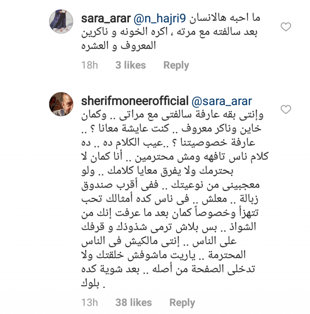 وأثار النجم المصري الجدل برده على إحدى الفتيات التي علقت : "ما احبه هالانسان بعد سالفته مع مرته اكره الخونة وناكرين المعروف والعشرة " ، حيث هاجمها وكتب : " وانتي بقى عارفة سالفتي مع مراتي..وكمان خاين وناكر معروف.كنت عايشة معانا..عارفة خصوصيتنا؟..عيب الكلام ده.. كلام ناس تافهة ومش محترمين..انا كمان لا بحترمك ولا يفرق معايا كلامك..لو معجبيني من نوعيتك..في اقرب صندوق زبالة..معلش..في ناس كده امثالك تحب تتهزأ..وخصوصا كمان بعد ماعرفت انك من الشواذ..بس بلاش ترمي شذوذك وقرفك على الناس..انتي مالكيش في الناس المحترمة..ياريت ماشفش خلقتك ولا تدخلي الصفحة من اصله..بعد شوية كده بلوك . "