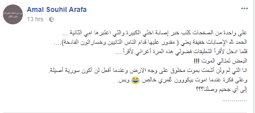 وأضافت: "قلما ادخل لأقرأ التعليقات. فضولي هذه المرة أغراني لأقرأ... البعض تمنالي الموت!!! انا التي لم ولن أشمت بموت مخلوق على وجه الارض، وعندما أفعل لن أكون سورية أصيلة".