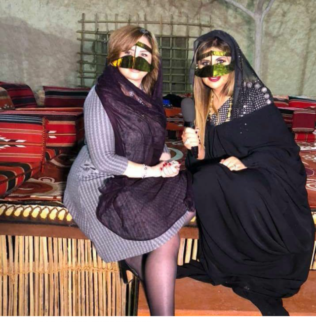 وظهرت إلهام وبوسي وهما ترتديان البرقع الخليجي، وعلقت شاهين على الصورة قائلة: "فعاليات المهرجان مكان بدوي جميل والبلد رائعة وناسها جميلة".