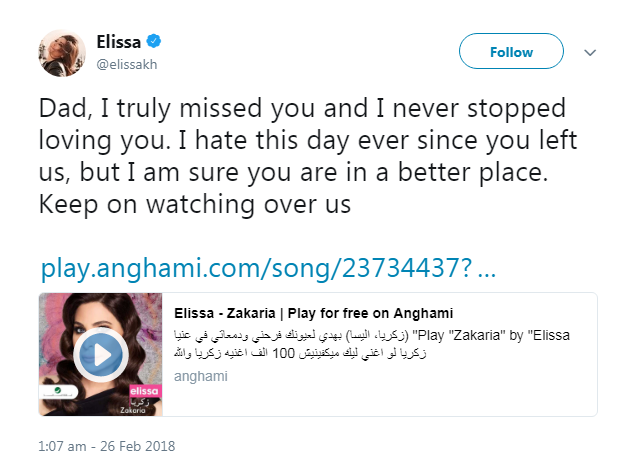 أعربت النجمة اليسا عن استمرار حزنها لرحيل والدها زكريا خوري منذ 14 عاماً، مغردةّ كلمات مؤثرة عبر حسابها الرسمي في موقع "تويتر"، تحدثت فيها عن كرهها لذلك اليوم الذي رحل فيه والدها.