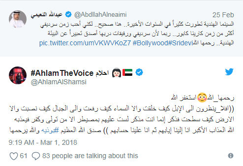 ورفضت أحلام دعاء الكاتب الإماراتي عبد الله النعيمي بالرحمة لنجمة بوليوود التي لقيت مصرعها مؤخرًا في دبي، بعد أن غرّد: "السينما الهندية تطورت كثيرًا في السنوات الأخيرة.. هذا صحيح.. لكني أحب زمن سرديفي أكثر من زمن كارينا كابور.. ربما لأن سرديفي ورفيقات دربها أصدق تعبيرًا عن البيئة الهندية.. رحمها الله".