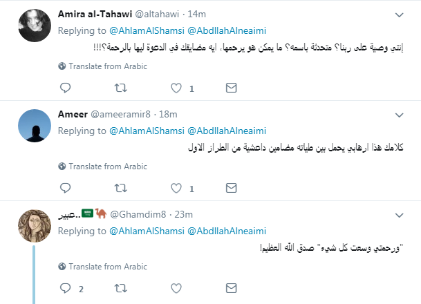 وردّت الفنّانة الإماراتية: "رحمها الله استغفر الله (أفلا ينظرون إلى الإبل كيف خلقت، وإلى السماء كيف رفعت، وإلى الجبال كيف نصبت وإلى الأرض كيف سطحت فذكر إنما أنت مذكر لست عليهم بمصيطر إلا من تولى وكفر، فيعذبه الله العذاب الأكبر، إنا إلينا إيابهم ثم إنا علينا حسابهم) صدق الله العظيم #بوذية والله يرحمها".