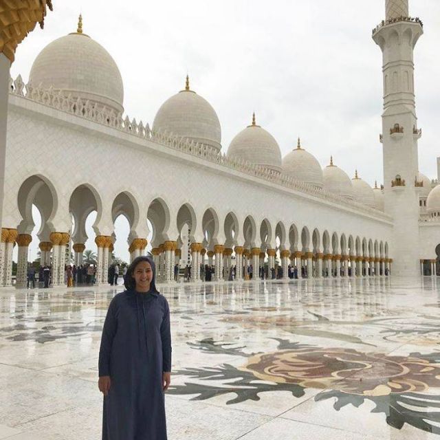 ونشرت الفنانة المصرية صورة لها، عبر حسابها على تطبيق "انستغرام"، ظهرت فيها وهي ترتدي عباءة وحجاباً في الساحة الخارجية لمسجد الشيخ زايد في أبوظبي.
