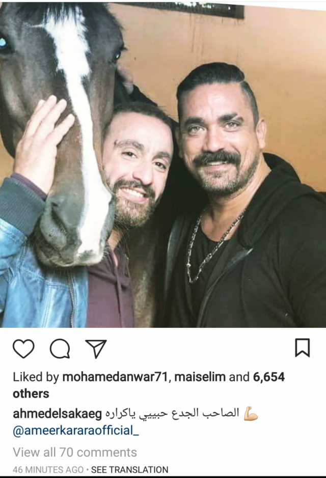 حرص النجم احمد السقا على نشر صورة عبر صفحته على "إنستغرام"، من داخل الإسطبل الخاص به، وظهر فيها مع حصانه برفقة النجم أمير كرارة.