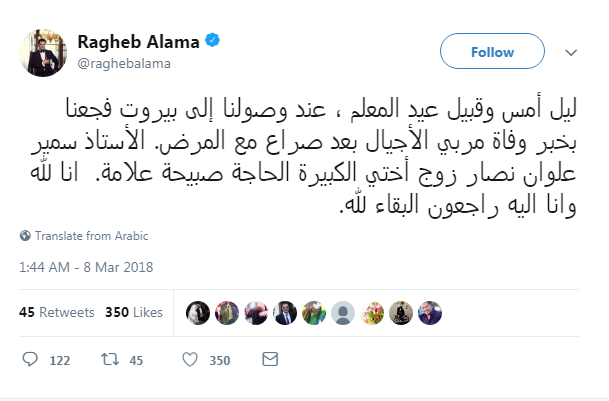 وغرّد المطرب اللبناني عبر "تويتر": "ليل أمس وقبيل عيد المعلم، عند وصولنا إلى بيروت فجعنا بخبر وفاة مربي الأجيال بعد صراع مع المرض. الأستاذ سمير علوان نصار زوج أختي الكبيرة الحاجة صبيحة علامة. انا لله وانا اليه راجعون البقاء لله".