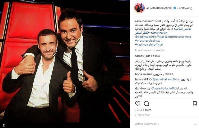 ونشر على تطبيق "انستغرام"، صورة جمعته بالساهر من كواليس برنامج "ذا فويس"، وعلّق عليها قائلا: "ربَ اخٍ لم تَلدهُ لكَ أمّكَ وانت يا ابو وسام الغالي اخ وصديق افتخر بمحبه وصداقته اتمنى لك كل التوفيق في حياتك الفنية والعائلية عاصي الحلاني كاظم الساهر".