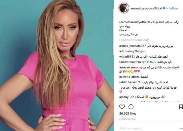 ونشرت صورة لريهام من خلال حسابها الخاص على "إنستغرام" وعلقت عليها قائلة: "براءة صديقتي الإعلامية ريهام سعيد.. الحمد لله".