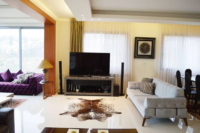 أما الصالون الرابع فخُصّص للتلفاز بحيث يمكن مشاهدته من كل الصالونات الأخرى، وقد ضمّ صوفا كبيرة رمادية اللون، تجمع بتصميمها ما بين العصرية والكلاسيكية، فبدت وثيرة وتتيح جلسة مريحة. كما غطّت الأرضية قطع من السجاد العصري والعجمي بتناغم تام.