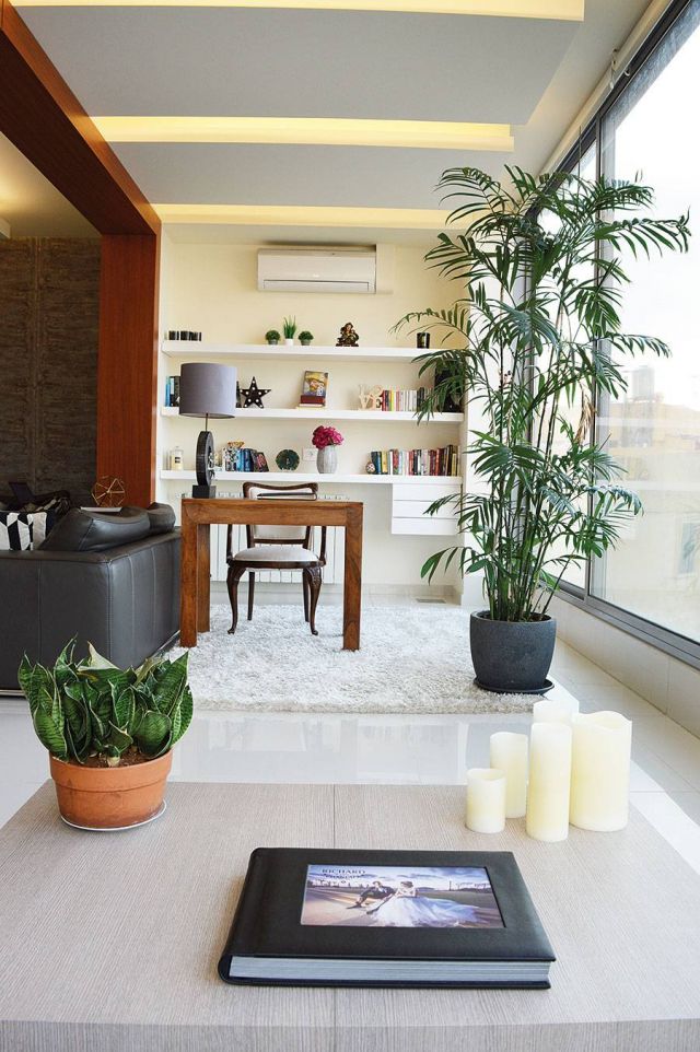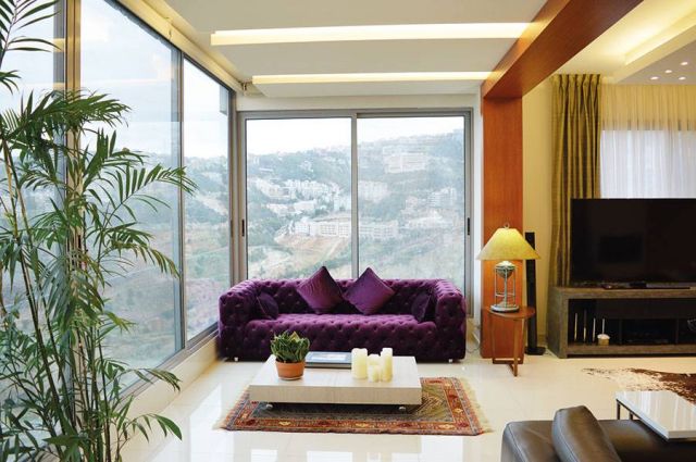 في أحد الصالونات تتمدّد كنبة كبيرة من الجلد، ويظهر في الخلفية ركن خاص هو عبارة مكتب يحوي كرسياً من «الأنتيك» ومكتبة ضخمة تحمل رفوفها كتباً نفيسة وتزخر بأكسسوارات مختلفة الأشكال، وتمضي المالكة جلّ وقتها في هذا الركن من المنزل ما بين المطالعة وتسهيل أعمالها. وبرزت في الصالون الرئيس كنبة كبيرة من طراز «شسترفيلد» الإنكليزي بلونها البنفسجي الحالم، واستلقت أمامها طاولة من الخشب الرمادي اللون.