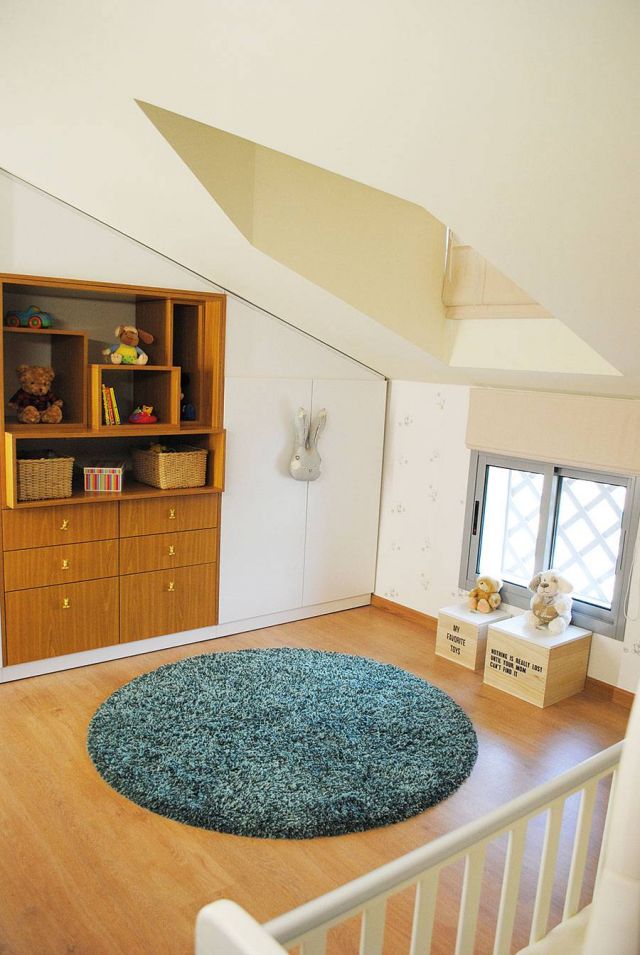 وبما أن العائلة استقبلت حديثاً مولودها الأول، وللتعبير عن فرحتها الغامرة به، طلبت من المهندسة ألواناً حيادية لغرفته، لذا تم التركيز على لونَي البيج والأبيض، مع تموّجات من الأزرق الفاتح، تناسقت في الأثاث والستائر والأكسسوارات وقطع السجاد، وكل ذلك ليهنأ الطفل بنومه ويسترسل في أحلامه... "