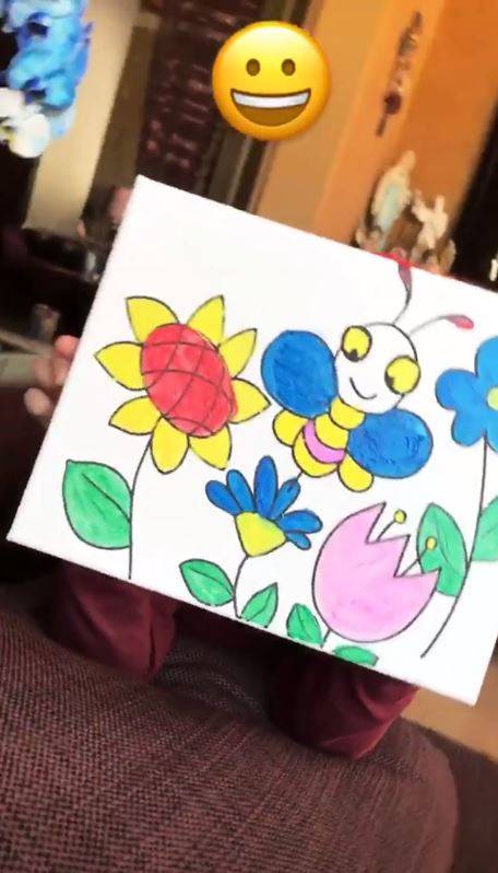 وفي مقطع ثان، قدمت لها ابنتها الصغيرة الصورة التي حضرتها مع والدها، وهي عبارة عن ورود وفراشة كبيرة، وأخبرتها بكل طرافة أنها ورود الربيع، والفراشة تحتاج الى الورود لتكبر.