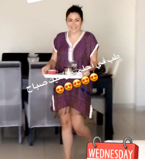 ونشرت الجندي مقطع فيديو عبر خاسية "ستوري" في حسابها على تطبيق "انستغرام"، خلال تقديم بياعة لها القهوة الصباحية، بلباس النوم القصير.