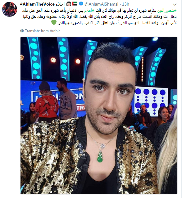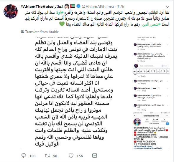 وغرّدت أحلام في حسابها الرسمي على موقع "تويتر": "شمس الدين ستأخذ شهرة لن تحلم بها في حياتك لأن قلت احلام. بس الانسان يأخذ شهرة على الحق مش على باطل. أنت وقناتك أقسمت ما راح أترككم، وحقي راح اخذه بإذن الله بفضل الله أولاً ولأني مظلومة وعلى حق، وثانيا لأني أأومن بنزاهة القضاء التونسي الشريف ولن اعلق اكثر. اكتفي بهالصورة وبهالقدر".