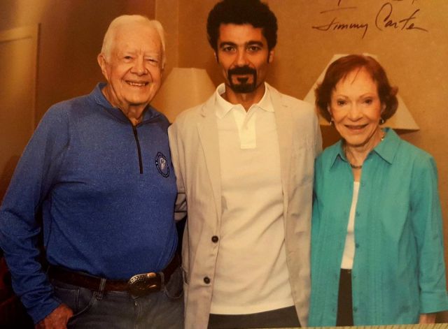 وحملت الصورة توقيع جيمي كارتر، الذي بدا ضاحكاً مع زوجته وخالد بينهما.
