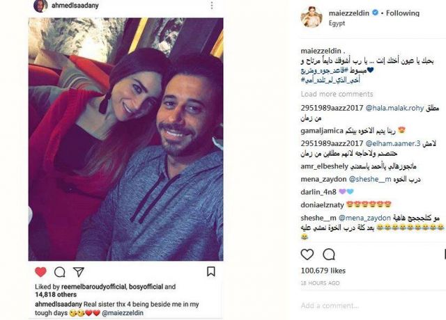 وكان السعدني علق على الصورة قائلا: "اخت حقيقية تقف جانبي في الأيام الصعبة"، لترد عليه مي قائلة: " بحبك يا عيون اختك ويا رب دايماً اشوفك مرتاح".