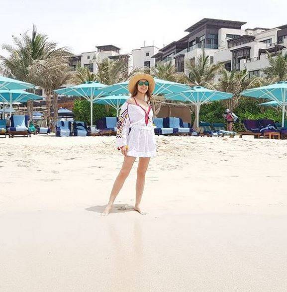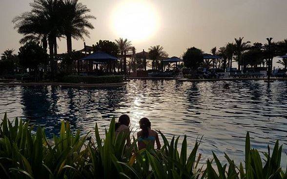 وفي صورة أخرى قالت: "رمل أبيض وشاطئ ساحر". وعبرت بصورة ثالثة عن سعادة بناتها ميلا وإيلا بأنهما: "لم يملا من قضاء الوقت على الشاطئ" وهي تتأملهم من الخلف وهن جالسات على حافة المسبح.