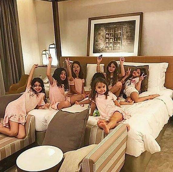 كما انتشرت على "انستغرام" صورة أخرى جميلة للأميرات الصغيرات يمرحن مع صديقاتهن على السرير الكبير لغرفة الفندق.