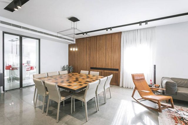 وقد تماشت مع لون الخشب المقلّم للجدار الذي ضمّ الدروسوار والخزائن الخاصة بغرفة الطعام. وحول الطاولة مقاعد من الجلد البيج.