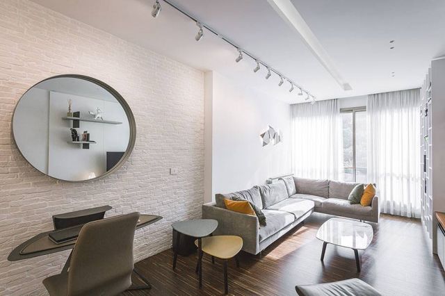مساحة الاستقبال أبقت رغم الألوان المستعملة للأثاث على لون طبيعي موحّد. وساهم البلاط الرمادي في تظهير هذا التناغم بين الأثاث والسقف الأبيض البسيط التصميم الذي غابت عنه الأشكال الهندسية في الجفصين، بل اكتفت المهندسة بوضع إنارة موجّهة على سكك حديد ولّدت جواً مميّزاً.