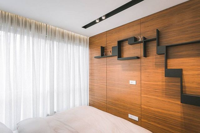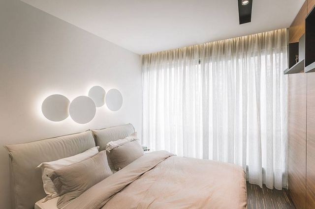 وكذلك في غرف النوم، الألوان الموحّدة والزاهية هي الطاغية. غرفة الماستر لونها بيج وجدارها خلف السرير تزّين بإنارة خرجت من مستديرات معلّقة بعضها ببعض، من البلكسي الأبيض زادت المكان شفافية إلى جانب الستائر الفوال كما في كلّ المنزل، هدفها المحافظة على النور الآتي من الخارج من خلال الواجهات الزجاج وموقع المنزل المشرف من الأعالي.