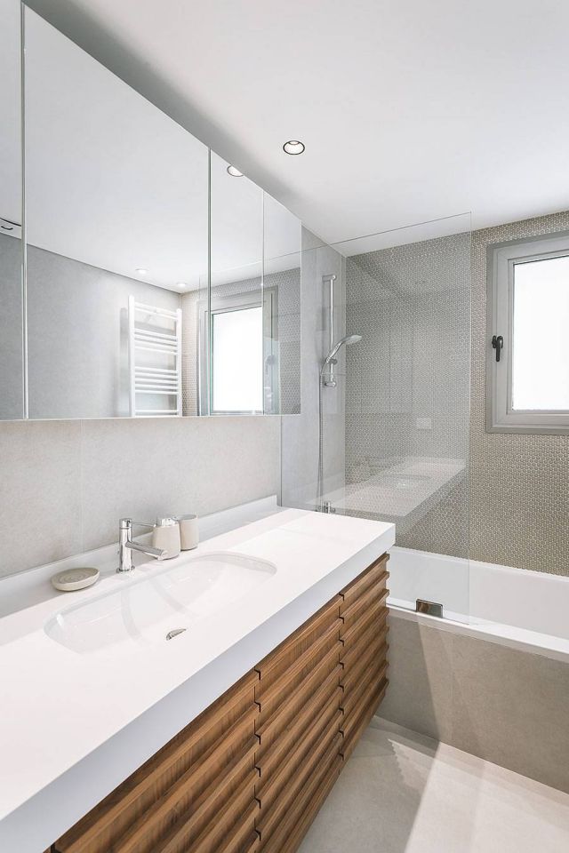 حمّام الضيوف بدا كبير الحجم بفضل المرايا التي وضعت في الزوايا من الأرض إلى السقف على الجدران المطلية بلون الباطون الطبيعي.