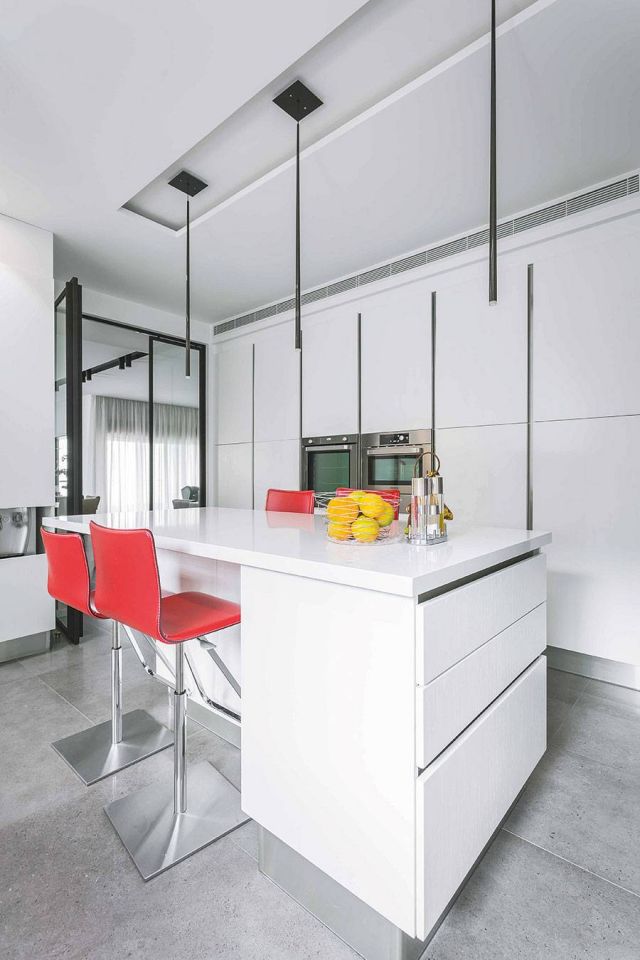 فالمطبخ بلونه الأبيض الناصع للأرض والخزائن والطاولة نضر ومشعّ وأنيق، وقد زاده اللون الأبيض نوراً إضافياً إلى جانب الأرض الرمادية. واللمسة الفريدة من الألوان تجسّدت في المقاعد الجلد الحمراء التي ارتفعت حول الطاولة المصمّمة على شكل بار.