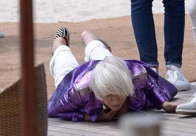 ويبدو أن النجمة البالغة من العمر 72 عاماً لم تتمكن من الاستمرار في المشي بملابسها البيضاء ومعطفها الارجواني، حيث سقطت على الارض فجأة، ووقفت بعد مساعدتها من قبل آخرين، ونجحت في التعامل مع الأمر بسلاسة وبابتسامة.