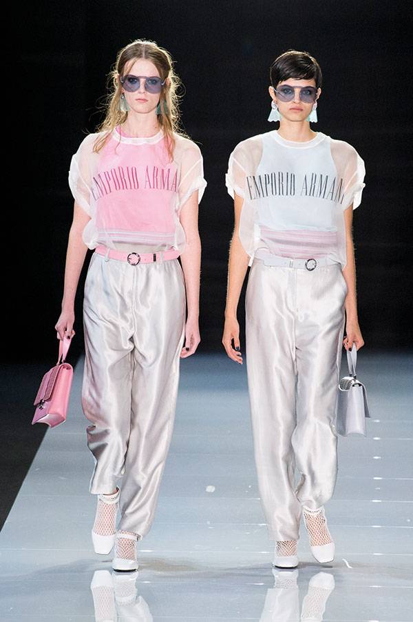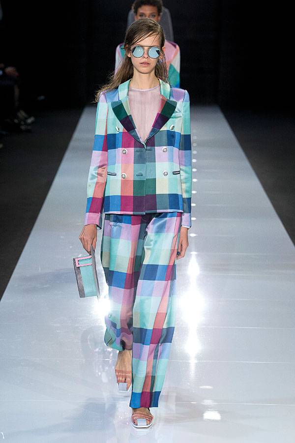 تألفت مجموعة أرماني من 113 طلة، علماً أن الماركة تعرض تصاميمها في لندن للمرة الأولى منذ 11 عاماً. وكانت العودة رائعة مع التلميحات إلى حقبة الستينيات وشارع كارنابي ومجموعة الألوان المعتمدة في أزياء الملكة. بالفعل، طغت الخطوط الملونة على المعاطف والسراويل الواسعة الأرجل والفساتين التي ترافقت مع أكسسوارات بظلال ساطعة مثل الأحمر والبرتقالي والأزرق. ثمة لمسة ملكية في السترة الوردية المطبّعة بالمربعات، والسترة الطويلة والضيقة، والبذلة الكاملة المترافقة مع كنزة مطبّعة بالأشكال الهندسية وسروال من الكتان.البذلات الوردية والزرقاء الفاتحة كانت باهتة وفضفاضة، ومهدت الطريق أمام السترات المزينة بالأبليكيه والبرق اللمّاع والسراويل الكاكية اللون. ثم جاءت الفساتين الفاتحة اللون، والفساتين القصيرة المنخفضة الخصر ذات التنانير المنتفخة والفساتين الضيقة بألوان الليلكي والأزرق والوردي.