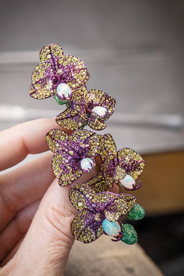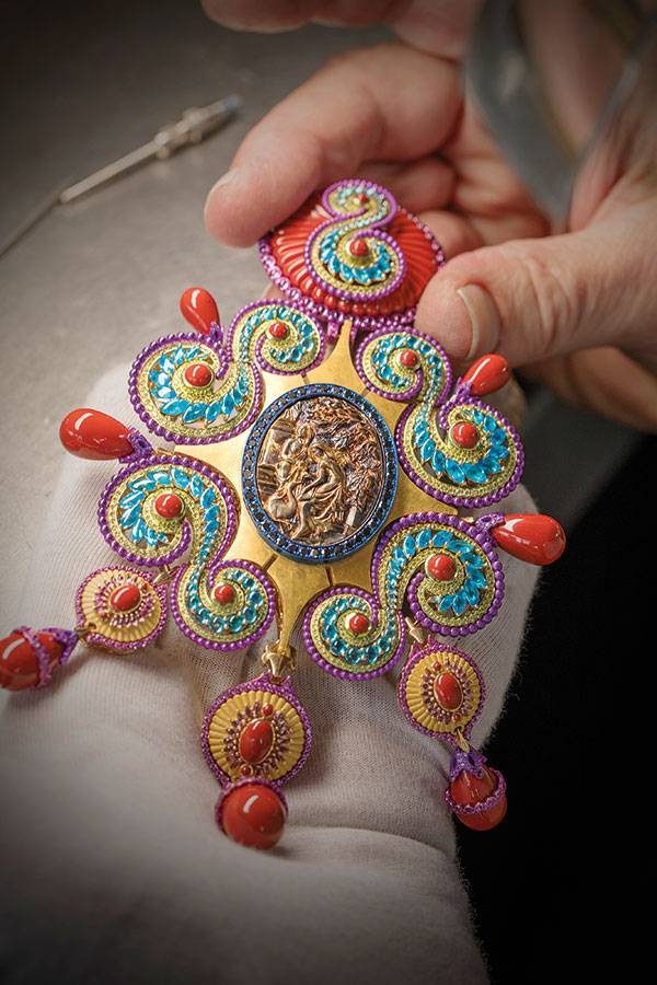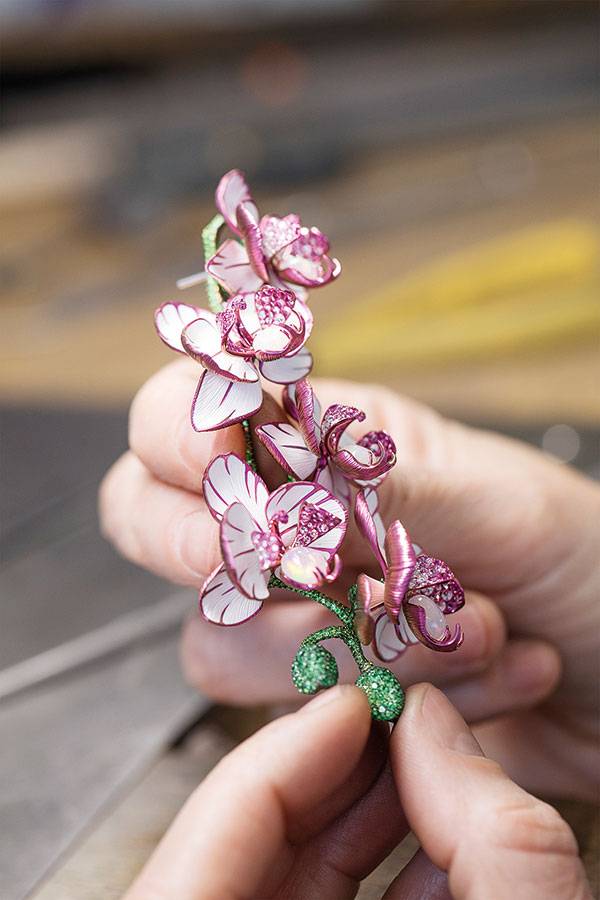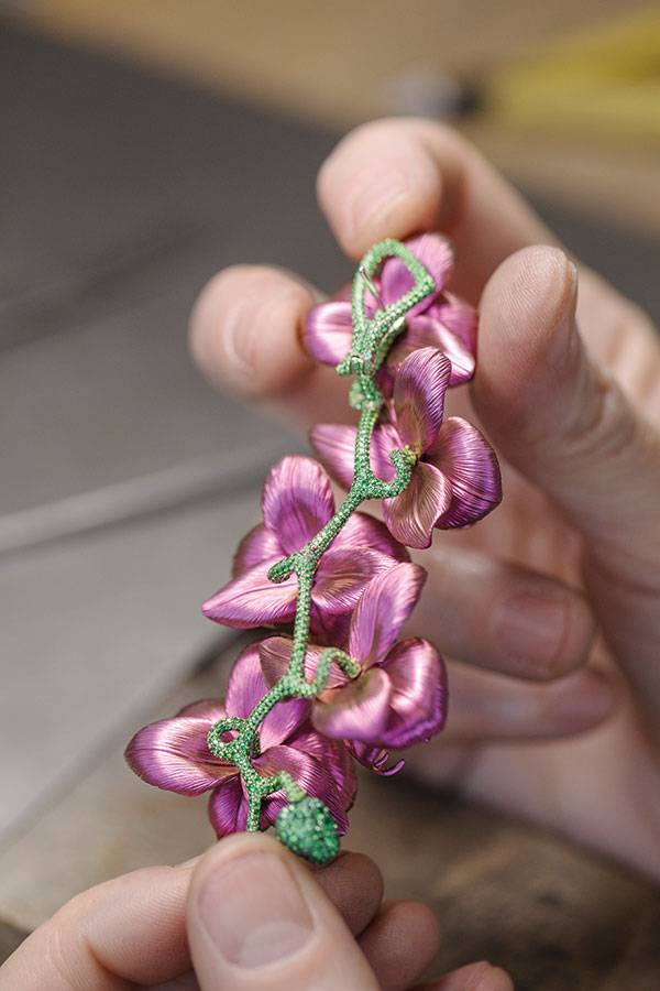 بين شوبارد ومهرجان «كان» قصة حب لا تنتهي... وكأن كارولين شوفوليه، المديرة الفنية والرئيس المشارك لدار شوبارد قد تسلّلت إلى أكثر الحدائق سحراً وجمالاً، وقطفت فرعاً من زهرة الأوركيد لتقدمه تكريماً لعشق السينما. قرطان بديعان يتألّقان بساق ذهبي وبراعم خضراء من الأحجار الكريمة البرّاقة. أما الأزهار فتتفتح بأحجار الأوبال البيضاء لتضفي تأثيرات ضوئية وردية آسرة. أما الإصدار الآخر فتزيّنه زهرات أرجوانية من التيتانيوم مرصّعة بأحجار العقيق والصفير الأصفر. القلادة بدت مذهلة حقاً. هي تحفة فنية متلألئة صيغت تفاصيلها بدقّة متناهية من الأحجار الكريمة والريش، وبوحي من الأزياء والحِرف التقليدية لشعوب منغوليا.