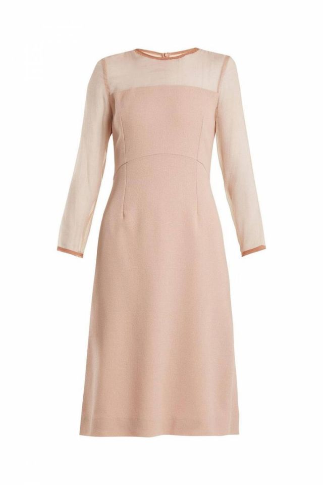 وأطلت ميغان بإطلالة أنثوية ناعمة باللون الزهري الخفيف حيث إختارت فستاناً بسيطاً وناعماً حمل توقيع علامة Goat ويبلغ ثمنه نحو 450 دولار أميركي، وأكملت إطلالتها بحذاء من نفس لون الفستان من Tamara Mellon يبلغ ثمنه نحو 450 دولار أميركي، ونسقت ملابسها بحقيبة يد رسمية منWilber & Gussie .