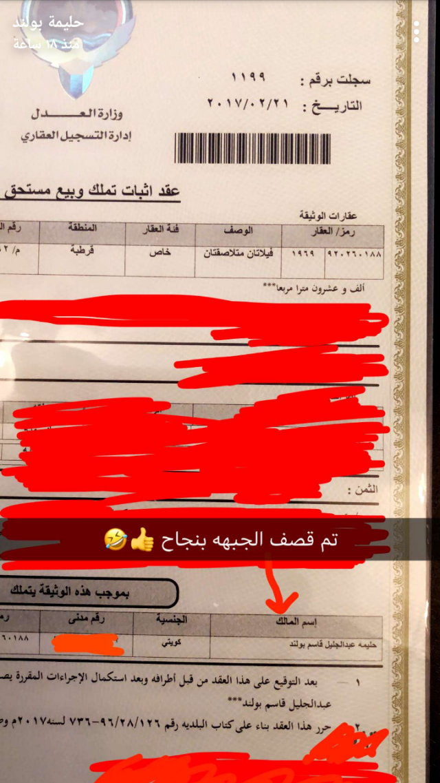 كذلك نشرت وثيقة تثبت ملكية منزلها الجديد، وذلك رداً على شائعة تشير إلى أنه مستأجر. وعلقت: "تم قصف الجبهة بنجاح " .