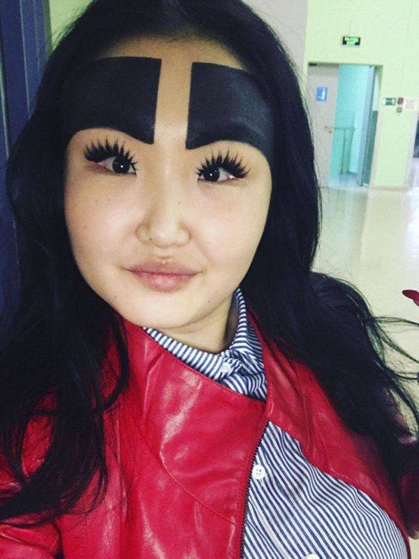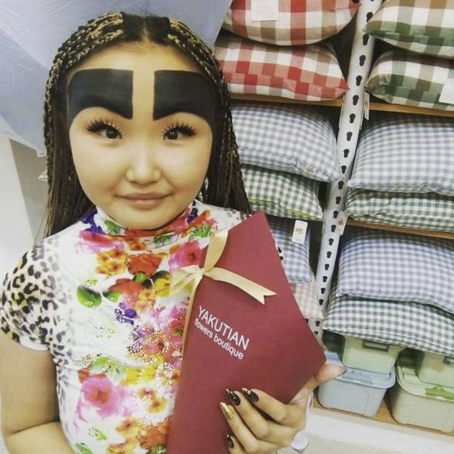 وفي التفاصيل أن الفتاة تعتمد موضة حاجبين غريبة جداً. فقد جعلتهما يأخذان شكل مربعين عريضين باللون الأسود.