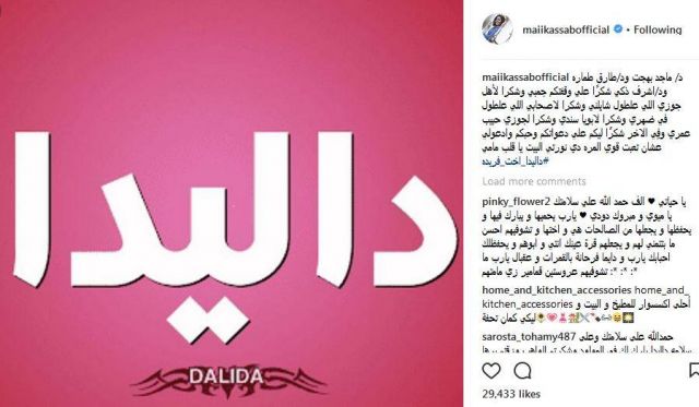 ونشرت صورة باسم داليدا وعلقت عليها لتقول: "شكرا على وقفتكم جنبي وشكرا لأهل جوزي اللي علطول شايلني وشكرا لاصحابي اللي علطول في ضهري وشكرا لابويا سندي وشكرا لجوزي حبيب عمري"، في إشارة إلى معاناتها قبل وخلال الولادة.