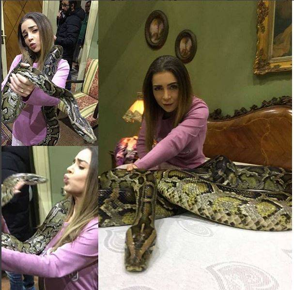 وتظهر النجمة المصرية في مجموعة من الصور وهي تلاعب أفعى ملونة كبيرة وضخمة، وقامت بكل جرأة بحملها ولفها حو عنقها ومحاولة تقبيلها، وبدت في غاية السعادة.