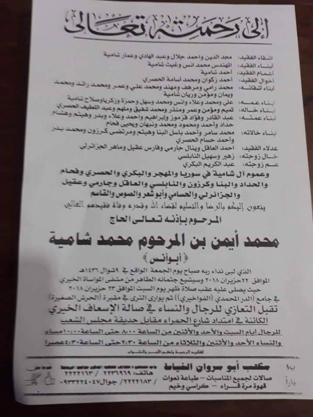 وكتبت الفنانة عبير شمس الدين: " لصديق الراقي أيمن شامية، لك الرحمة ولنا الصبر والسلوان، رحمة الله عليك".