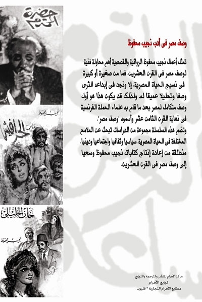 والجدير بالذكر أن هذه السلسلة بدأت الشهر الماضي بكتاب عن الرؤساء والملوك والزعماء، الذين ورد ذكرهم، سواء في شكل مباشر أو غير مباشر، في أدب نجيب محفوظ. وسيتناول الكتاب الثالث في السلسلة، والذي سيصدر الشهر المقبل، القرآن الكريم في أدب نجيب محفوظ. وتقوم فكرة هذه السلسلة التي يأتي صدورها عشية انطلاق الاحتفال بمئوية عميد الرواية العربية، والذي سيستمر طوال عام 2011، على أن نجيب محفوظ تناول الكثير من فئات المجتمع المصري، وأوجه الحياة فيه، إلى الحد الذي يتيح لنا أن نعيد قراءة أدبه باعتباره وصفاً لهذا المجتمع، وتحليلاً للكثير من تفاعلاته، وتشريحاً لعدد غير قليل من مشاكله، وهو ما يعيد إلى الأذهان ما قام به علماء الحملة الفرنسية على مصر عندما وضعوا في مستهل القرن التاسع عشر الميلادي كتابهم الشهير «وصف مصر».