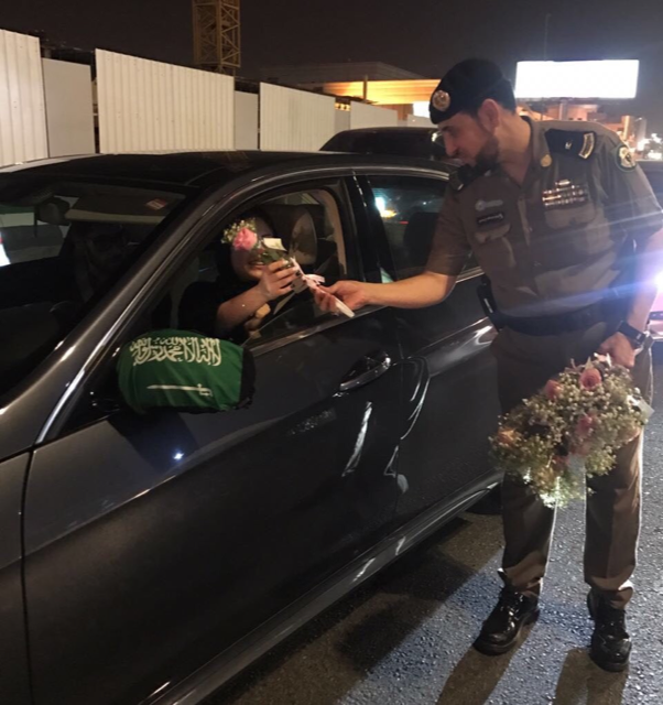 وأظهرت الصور استقبال رجال المرور في السعودية، السيدات قائدات المركبات بالورود دعما لهن وترحيبا بهن في شوارع المملكة، فيما شارك شباب رجال المرور في مبادرة #رافقتكم_السلامة، في جميع مناطق المملكة وقاموا بتوزيع الورود على كل سيارة تقودها امرأة في بادرة وصفتها مواقع التواصل بالجميلة والمحفزة والداعمة للمرأة ،فيما غمرت السعادة وجوه السيدات وهن يقدن سياراتهن.