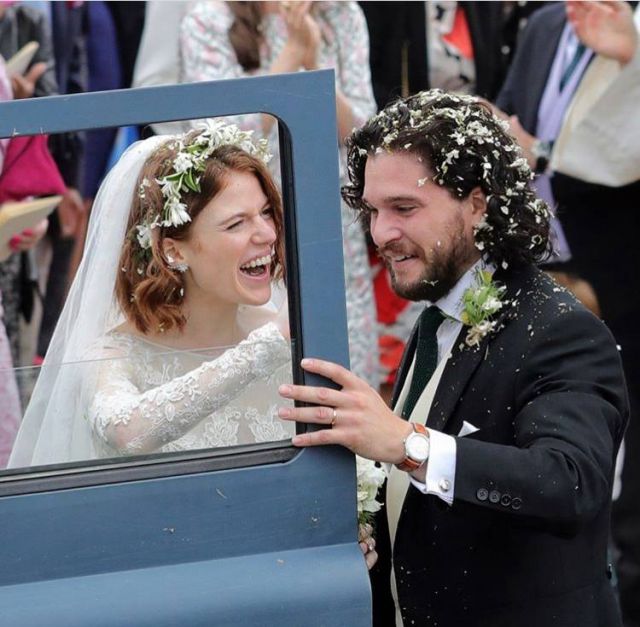 تزوج الممثلان البريطانيان كيت هارينغتون وروز ليزلي، بطلا مسلسل Game of Thrones "لعبة العروش" يوم السبت في شمال شرق إسكتلندا، ما دفع العريس الى ارتداء الزي التقليدي.