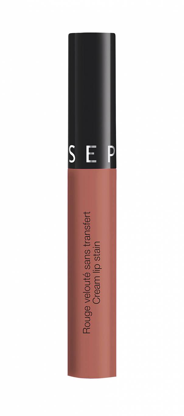 حدّدي شفتيك بقلم حيادي اللون Guerlain The Lip Liner in Bois des Indes no.42، وغلّفيهما بأحمر الشفاه المطفأ Sephora Collection Cream Lip Stain in Copper Blush no.23.