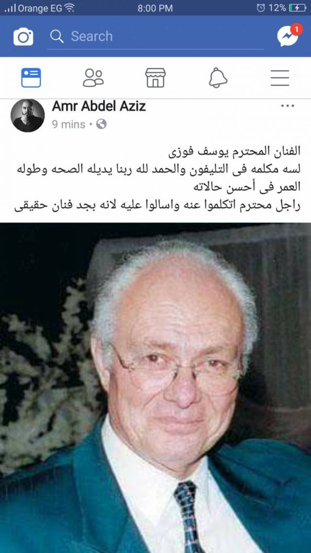 وكتب عمرو في حسابه على موقع "فايسبوك": "الفنان المحترم يوسف فوزي لسه مكلمه فى التليفون والحمد لله ربنا يديله الصحه وطولة العمر فى أحسن حالاته".