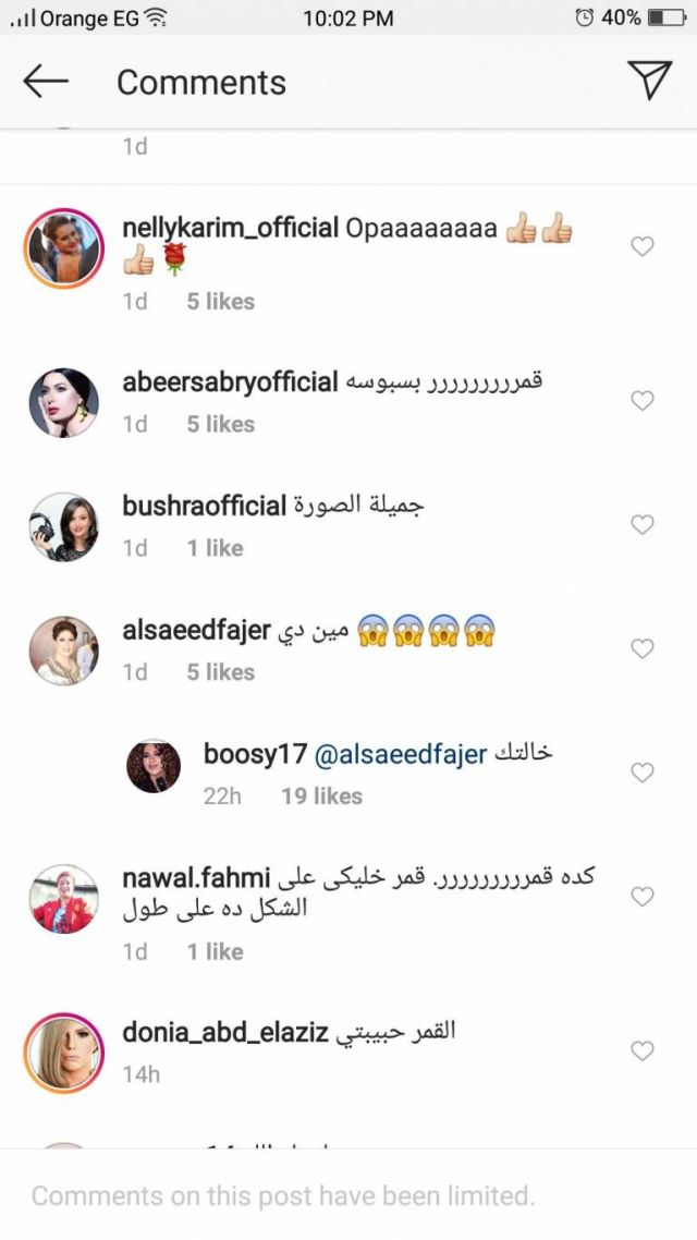 وبعد أن نشرت بوسي شلبي صورة تظهر من خلالها بمكياج يجعلها تبدو أصغر سنًا من عمرها الحقيقي، كتبت لها فجر ساخرة "مين دي"؟ لترد عليها بوسي بسخرية وتهكم: "خالتك".
