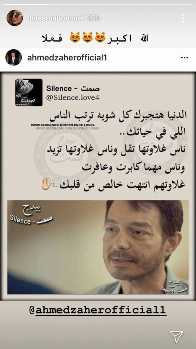 فاجأت الفنانة بسمة بوسيل متابعيها على "إنستغرام" بإعادة نشر صورة كان قد نشرها أحمد زاهر مكتوباً فيها: "الدنيا هتجبرك كل شوية ترتب الناس في حياتك... ناس غلاوتها تقل وناس غلاوتها تزيد وناس مهما عافرت غلاوتها انتهت من قلبك".