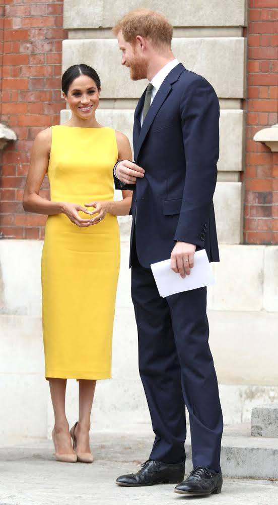 أطلت ميغان ماركل، دوقة ساسكس، افي مناسبة إجتماعية برفقة زوجها الأمير هاري، بفستان بسيط وضيق باللون الأصفر، أضفى على ملامحها إشراقةً لا مثيل لها، من توقيع المصمم الأميركي براندون ماكسويل، الذي كان يعمل منسق أزياء للنجمة ليدي غاغا في الماضي.