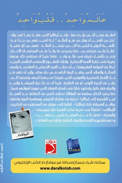 تعيش أسماء عايد (25 سنة) في إيطاليا، ويعد هذا الكتاب الصادر حديثاً عن دار «دوَن» في القاهرة كتابها الأول. الكتاب يناقش قضايا اجتماعية وإنسانية متنوعة، ويتضمن في أحد أبوابه ملفاً عن الهجرة غير الشرعية إلى إيطاليا، وفيه رصدت المؤلفة الكثير من الحقائق، بداية من عصابات التسفير وسماسرة الموت وانتهاء بواقع العيش في إيطاليا.