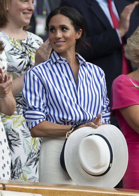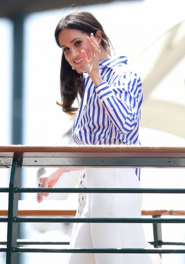 واستطاعت ميغان خطف الأنظار من جديد بإطلالتها العصرية الملائمة تماماً لأجواء مباراة رياضية خلال حضورها نهائي بطولة ويمبلدون للسيدات، إذ تألقت بسروال عريض باللون الأبيض من "رالف لورين"، يبلغ ثمنه نحو 1,690 دولاراً أميركياً ونسقت معه قميصاً كلاسيكياً مقلماً باللونين الأزرق والأبيض من العلامة نفسها يبلغ ثمنه نحو ثمنه نحو 590 دولاراً أميركياً، وأكملت إطلالتها بحقيبة يد من Altuzarra يبلغ ثمنها 1,595 دولاراً أميركياً. وللمسة ملفتة اعتمدت القبعة.