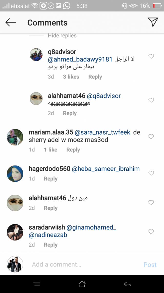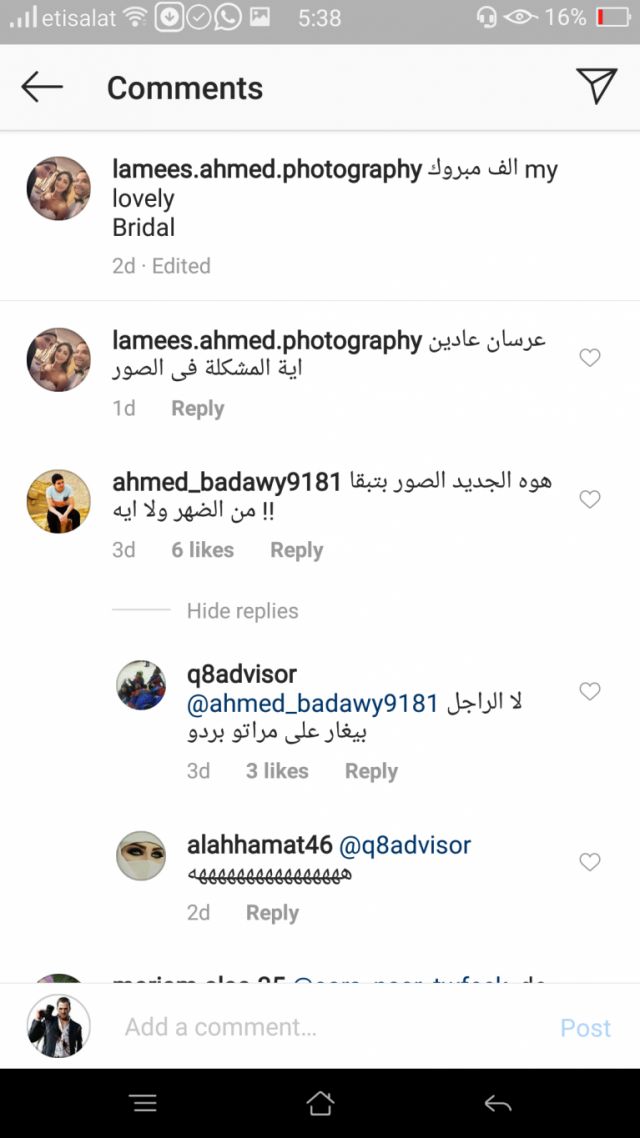 عقب ذلك قامت المصورة بحذف تعليقاتها على الصور بأنها تخص شيري عادل ومعز مسعود من حسابها على "إنستغرام"، ولكن ما لم تدركه أن بعض الجمهور قام بتصوير تعليقاتها وتداولوه على "السوشيال ميديا" قبل حذفه، واتهموا المصورة بالفبركة لاكتساب شهرة.