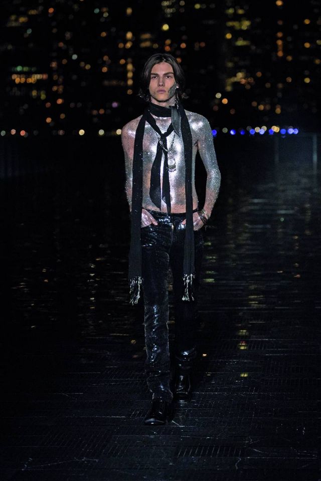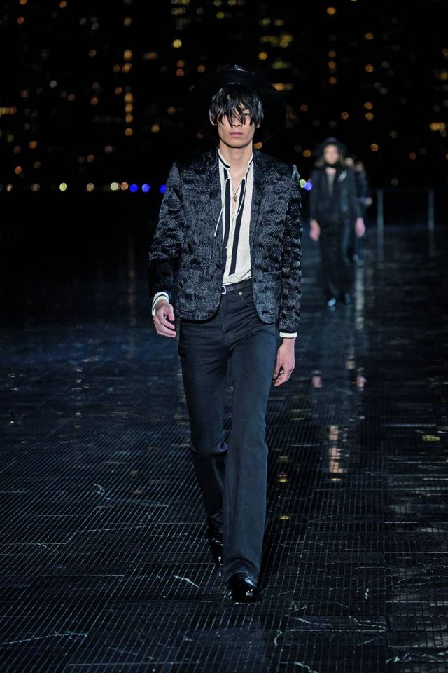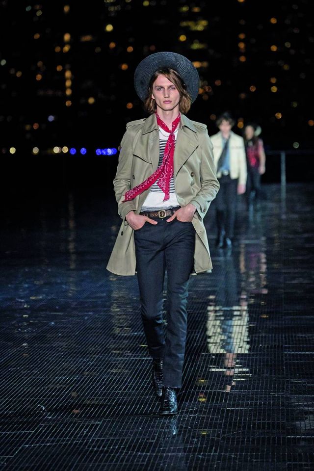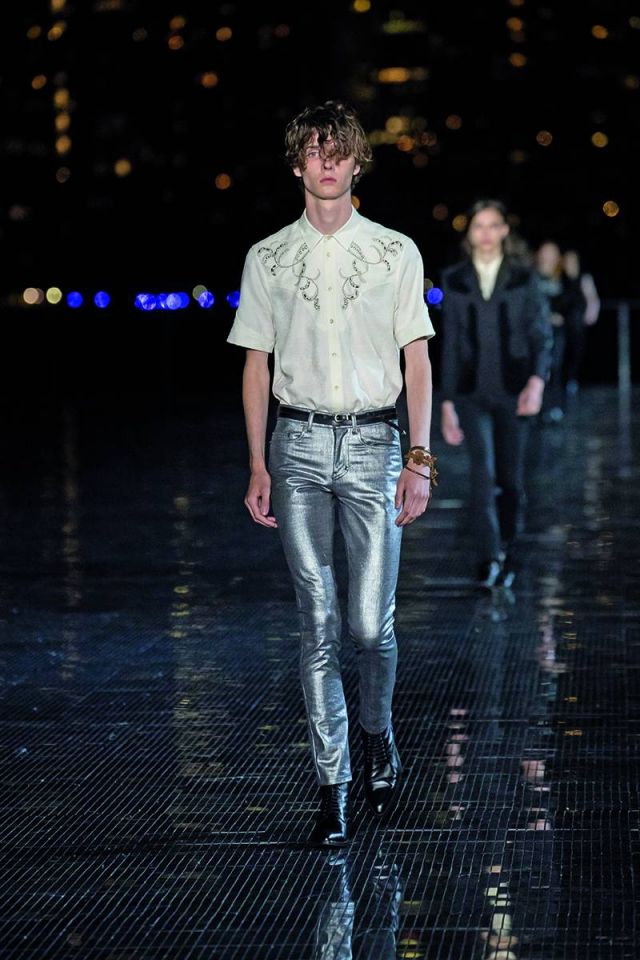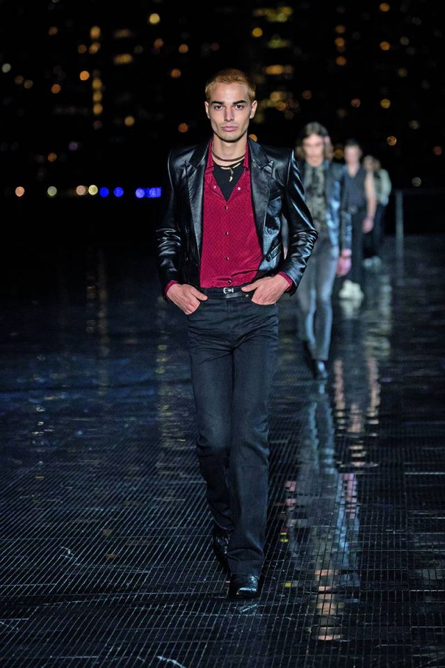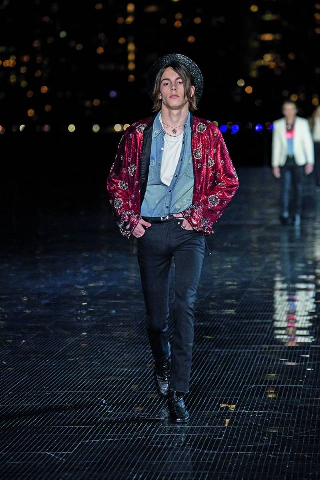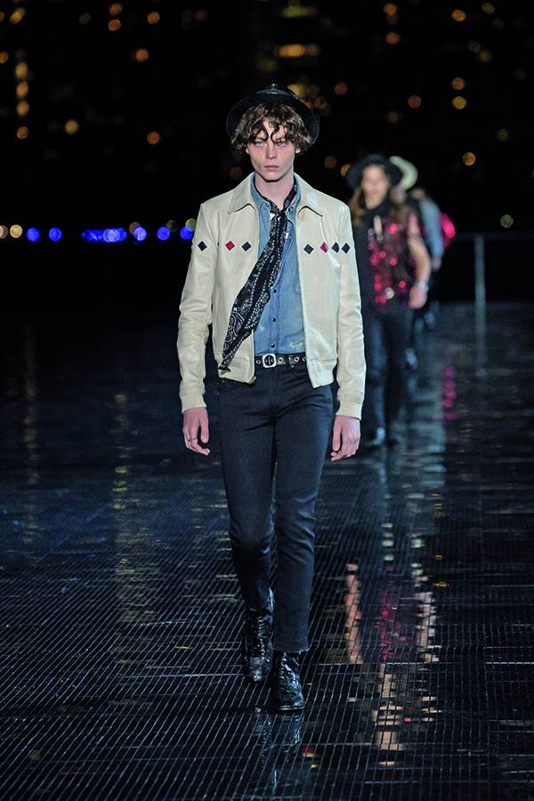 رغم مساهمته في تصميم بعض القطع خلال العامين الأولين من تسلّمه منصب المدير الإبداعي لدى دار سان لوران العريقة، إلا أن مجموعة الملابس الرجالية لموسم ربيع/صيف 2019 تعتبر الأولى للمصمّم Anthony Vaccarello بكاملها. وقد تمّ عرض هذه المجموعة المميزة التي تجسد الغرب الأميركي في حديقة Liberty State Park حيث شكّلت حدثاً رائعاً ومنظماً جمع حشداً كبيراً من أبرز الشخصيات المهمّة في عالم الأزياء والسينما والإعلام على مدرج فضي وممشى رخامي يواجهه مباشرة أفق مدينة مانهاتن الباهر. وقد مزجت المجموعة أسلوب موسيقى الروك أند رول مع مؤثرات الغرب الأميركي، حيث طغت الجاكيتات الجلدية السوداء وسترات السفاري وعِصابات الرأس والسراويل المطرّزة بالكامل بالترتر والأحذية المصنوعة من جلد الثعبان لتمنح عشّاق العلامة الفرنسية العريقة خزانة كاملة من ملابس رعاة البقر للرجل الذي يعيش في مدينة نيويورك بأسلوب السبعينيات.
