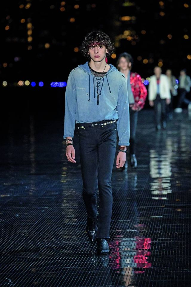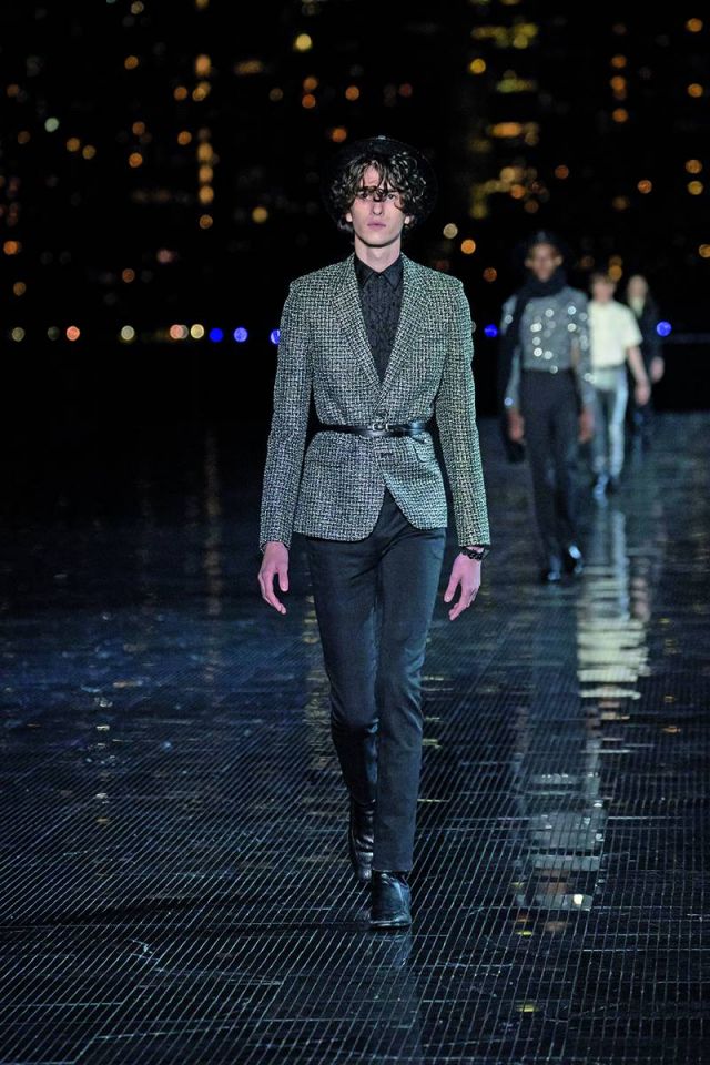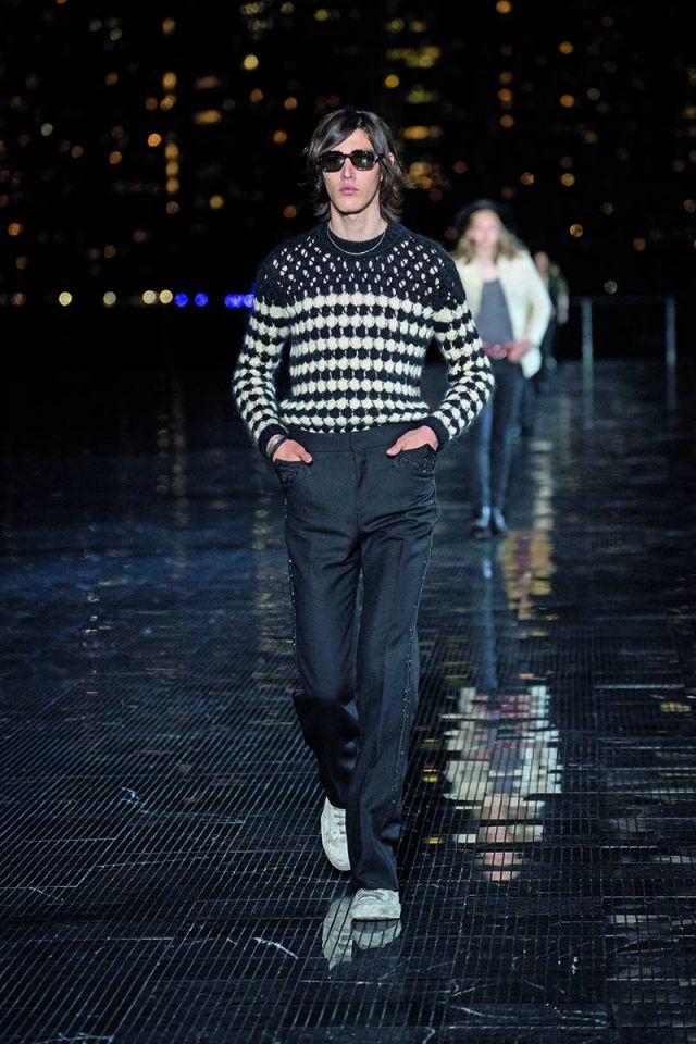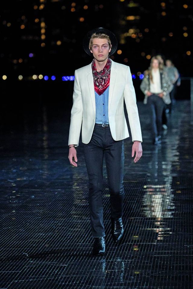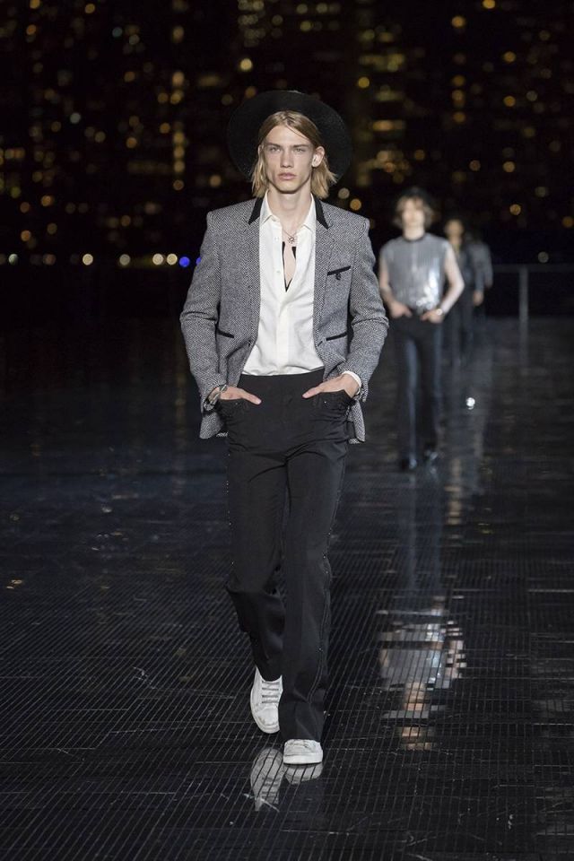 ومن الجدير ذكره، أن Vaccarello لم يبتعد كثيراً عن أسلوب التصاميم الرجالية التي وضعها Hedi Slimane المدير الإبداعي الأسبق لدى الدار، حيث رصدنا ذلك من خلال سراويل الجينز والسترات الجلدية الضيقة وقمصان رعاة البقر والأحذية ذات الكعوب العريضة وسترات المحارب المزركشة وسترات السفاري المصنوعة من الجلد والقمصان الشفافة وسراويل التوكسيدو اللامعة بأسلوب ألفيس بريسلي ومايكل جاكسون أحياناً. كما تزيّنت المجموعة بالأوشحة والقبّعات المصنوعة من القش والأحزمة والأحذية الرياضية البيضاء.