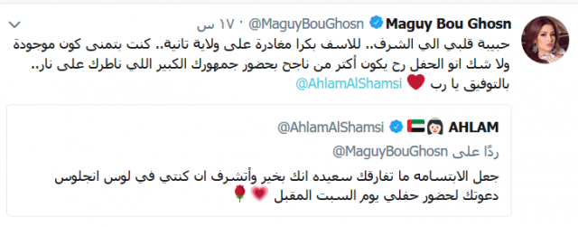 وكتبت أحلام متوجهة إلى الممثلة اللبنانية ماغي بوغصن عبر حسابها على "تويتر": "جعل الابتسامة ما تفارقك. سعيدة إنك بخير وأتشرف إن كنت في لوس أنجليس دعوتك لحضور حفلي يوم السبت المقبل".